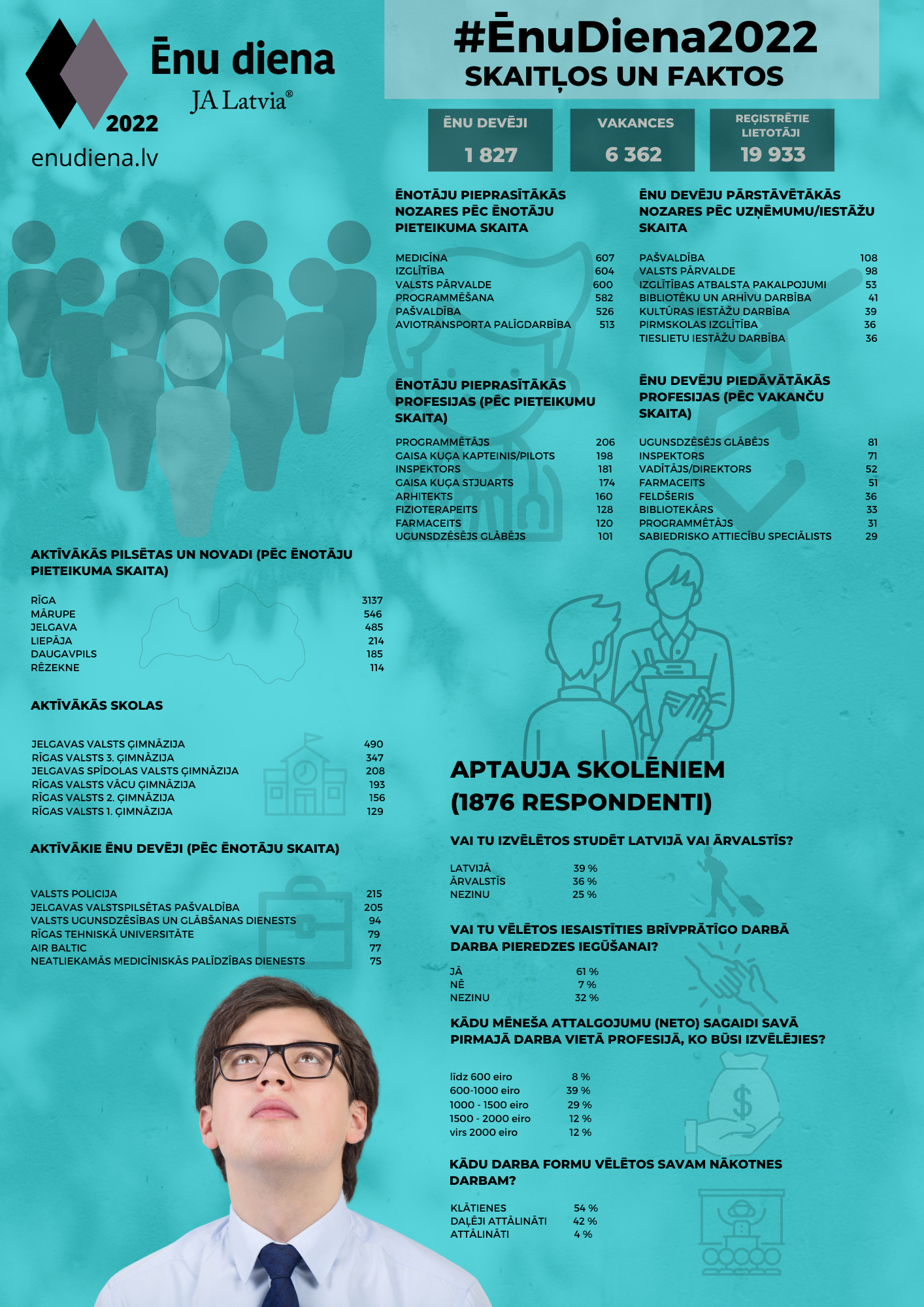 Šodien, pēc divu gadu pārtraukuma, visā Latvijā norisinās izglītības organizācijas “Junior Achievement Latvia” (JA Latvia) organizētais karjeras izglītības pasākums skolu jauniešiem Ēnu diena. Ēnotājus šogad ar dažādām profesijām iepazīstina 1827 ēnu devēji, kopumā piedāvājot 6362 vakances. Skolēnu pieprasītākā profesija šogad - programmētājs.